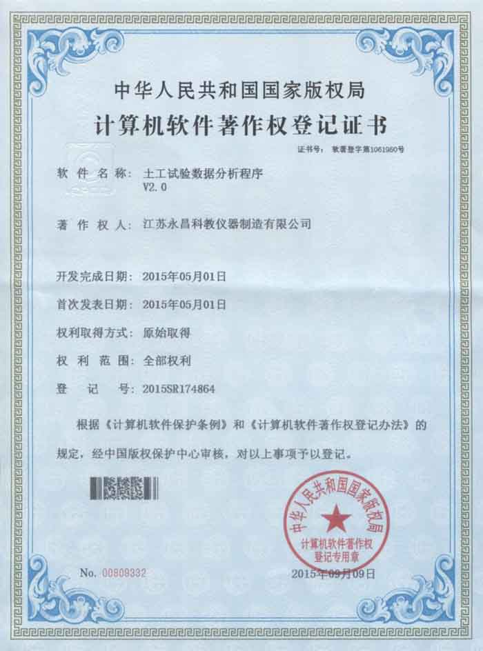 我公司土工試驗(yàn)數(shù)據(jù)分析程序V2.0通過中國版權(quán)保護(hù)中心審核,獲得中華人民共和國國家版權(quán)局版發(fā)的計(jì)算機(jī)軟件著作權(quán)登記證書。
