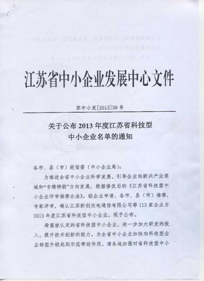 近日,公司通過(guò)江蘇省經(jīng)濟(jì)和信息化委員會(huì)(省中小企業(yè)局)的評(píng)審,被認(rèn)定為“江蘇省科技型中小企業(yè)”。